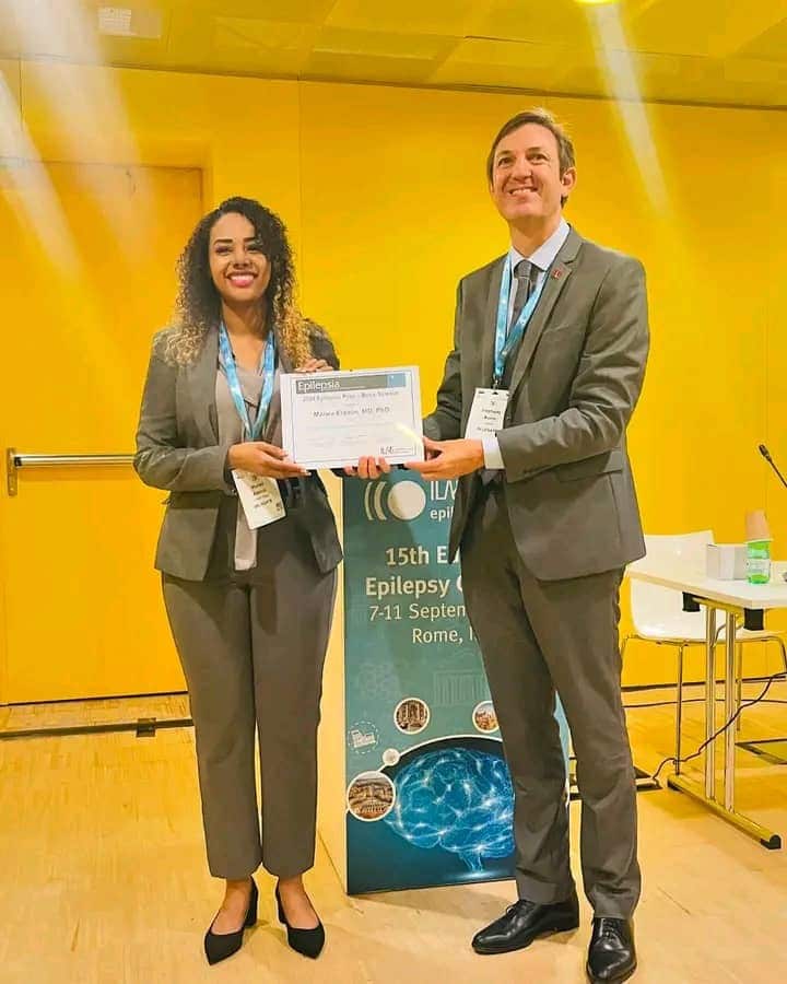 وعلى صفحاتها الرسمية على مواقع التواصل، الاثنين، قالت :تم اختيار بحثي من بين مئات الأبحاث ليفوز بجائزة Epilepsia، وتم منحي الجائزة في المؤتمر الأوروبي الخامس عشر للصرع في روما.