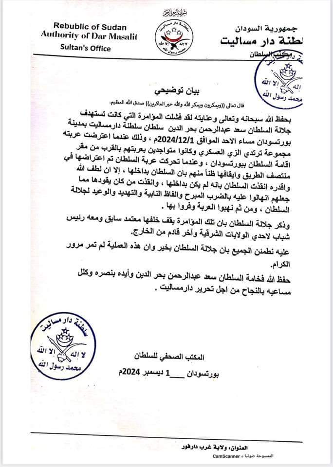وبحسب البيان الذى إطلع عليه (نبض السودان) فإن عربة عليها مجموعة ترتدى الزى العسكري كانت تقف بالقرب من مقر إقامة السلطان ، اعترضوا عربة مخصصة لسلطان لكنه لم يكن بها وقاموا بضرب السائق بصورة مبرحة واكالو التهم الى السلطان بالتهديد والوعيد ــ وفقا للبيان
