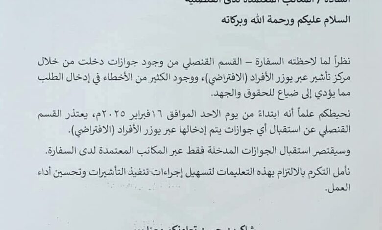 وأعلنت السفارة عن إعتذارها لإستقبال أي طلب جديد إبتداءا من يوم 16 فبراير، نظراً لما لاحظته السفارة – القسم القنصلي من وجود جوازات دخلت من خلال مركز تأشير>