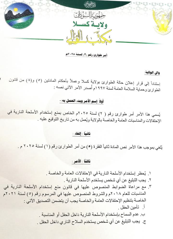 أصدر والي كسلا أمر طوارئ رقم رقم 2 للعام 2025 ، بمنع إستخدام الاسلحة النارية في الإحتفالات و المناسبات الخاصة بالولاية وذلك إستنادا الى قرار إعلان حالة الطوارئ بالولاية وعملا باحكام المادتين 5 و 8 من قانون الطوارئ وحماية السلامة العامة لسنة 1997م.