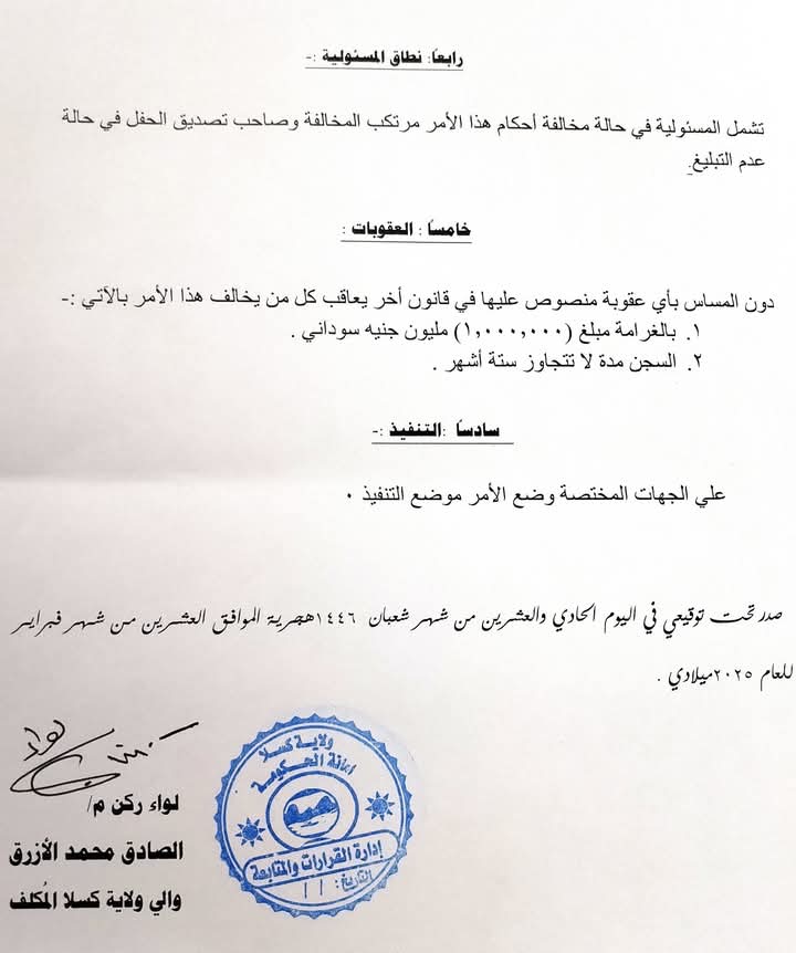 السودان.. والي كسلا يصدر قرار