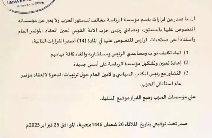 أصدر رئيس حزب الأمة القومي المكلف اللواء م فضل الله برمة ناصر قرارا قضى بحل مؤسسة الرئاسة بحزب الأمة القومي .