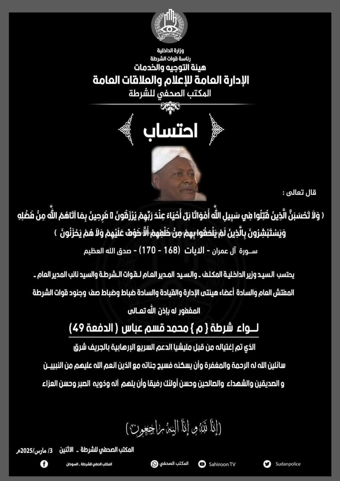 اغتال عناصر من مليشيا الدعم السريع بمنطقة الجريف شرق الـ لواء شرطة معاش محمد قسم عباس