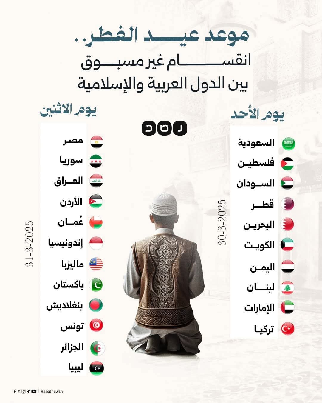 في حين أعلنت مصر والأردن والعراق وسوريا وسلطنة عمان وليبيا يوم الأحد المتمم لشهر رمضان، والاثنين أول أيام العيد.