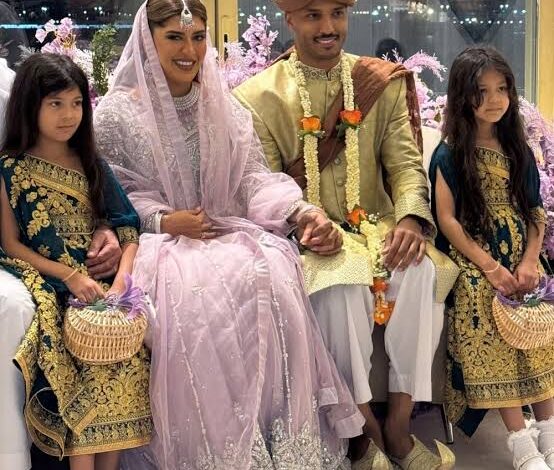 أما الإطلالة الثانية فحملت لمسة باكستانية خالصة، عكست أصول العروس، حيث ارتدى العريس زياً تقليدياً من الكورتا والبنطال مع العمامة، بينما تألقت هديل بفستان بنفسجي مزخرف وطرحة مطرزة وضعتها بأسلوب باكستاني مميز.