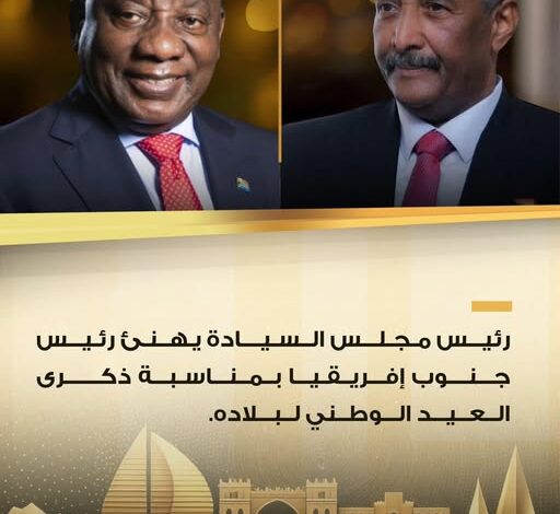 بعث رئيس مجلس السيادة الانتقالي والقائد العام للقوات المسلحة، الفريق أول ركن عبدالفتاح البرهان، برقية تهنئة إلى فخامة الرئيس سيريل رامافوزا، رئيس جمهورية جنوب إفريقيا، بمناسبة الذكرى السنوية لعيد بلاده الوطني الذي يوافق الثلاثين من أبريل.