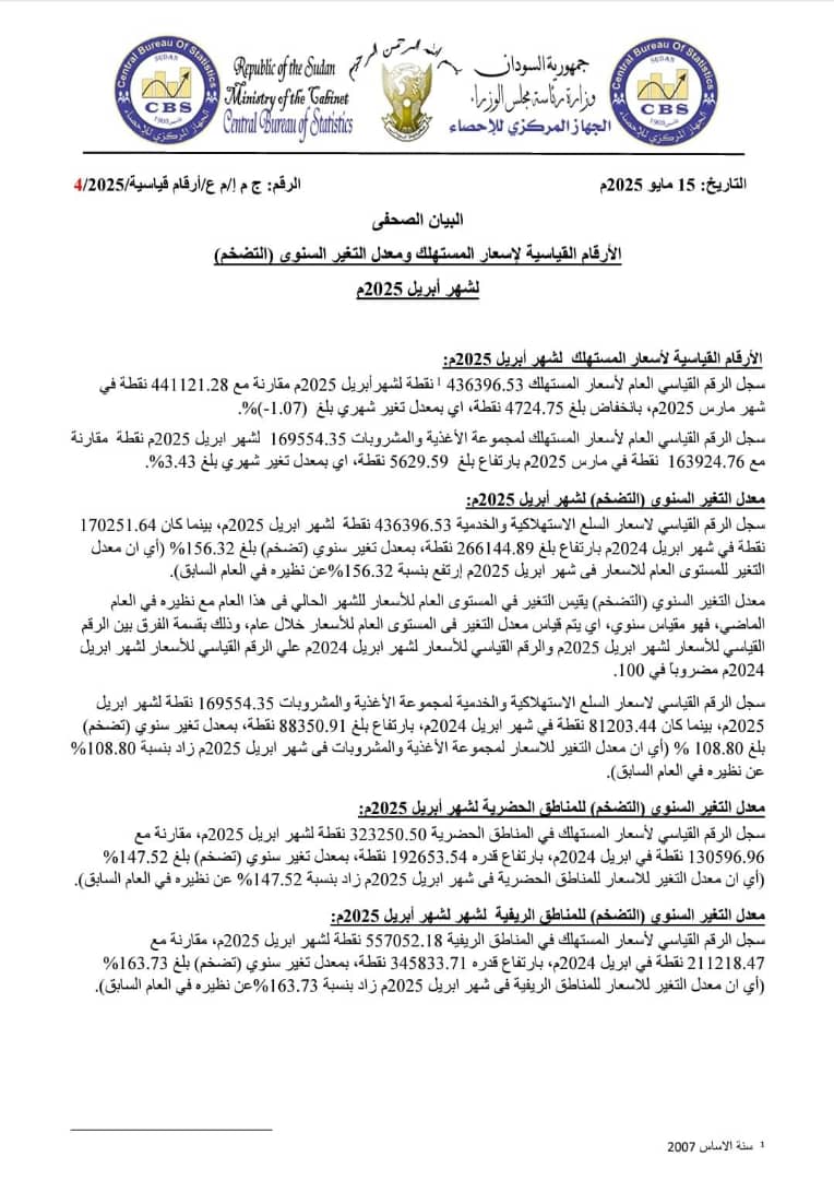 كشف الجهاز المركزي للإحصاء في السودان عن تراجع الرقم القياسي العام لأسعار المستهلك خلال شهر أبريل 2025 مقارنة مع شهر مارس من نفس العام، في مقابل تسجيل ارتفاعات سنوية كبيرة في مؤشرات التضخم على مستوى البلاد.