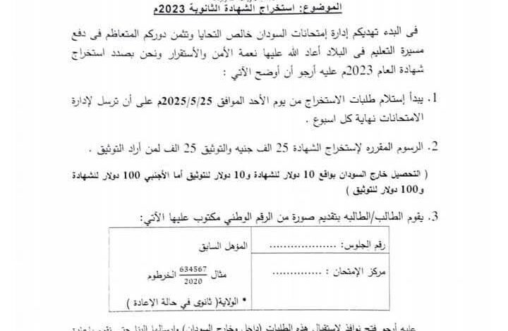 ونوهت إلى أنه يبدأ استلام طلبات الاستخراج من يوم الأحد الموافق 2025/5/25م على أن ترسل الإدارة الامتحانات نهاية كل أسبوع.