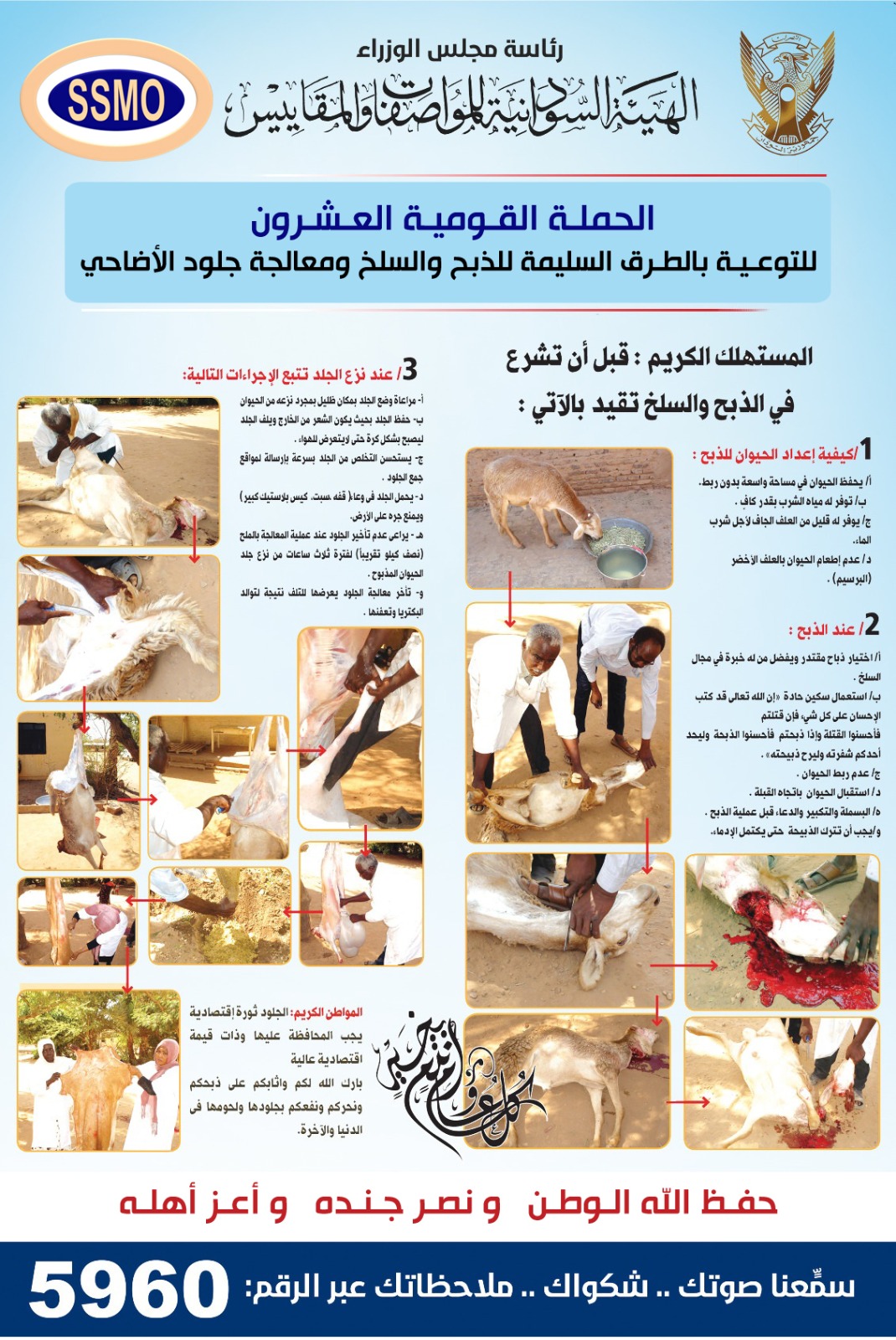 وأعلنت المدير العام للهيئة السودانية للمواصفات والمقاييس رحبة سعيد عبد الله عن إنطلاقة الحملة القومية العشرون للتوعية بطرق الذبح والسلخ السليم والمحافظة على جلود الأضاحي تحت شعار (الجلود ثروة قومية وقيمة اقتصادية) ، والتي تأتي هذا العام وسط ظروف معقدة بسبب الحرب .