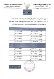 أصدرت سفارة جمهورية السودان في العاصمة السعودية الرياض إعلانًا مهمًا، خاطبت فيه المواطنين السودانيين المقيمين بالمملكة، متضمّناً تهنئة بمناسبة قرب حلول عيد الأضحى المبارك، وتوضيحًا بشأن المواعيد المقررة لاستخراج وتجديد جوازات السفر خلال عطلة العيد.