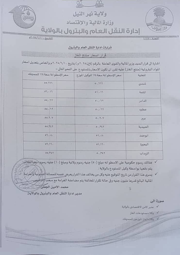 واصدر مدير إدارة النقل العام والبترول بالولاية محمد الامين الجعلي قرارا وصل (نبض السودان) نسخة منه، عدل بموجبه اسعار تعبئة الاسطوانة.