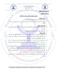 أشارت الهيئة في تقريرها اليومي إلى أن الطقس المتوقع خلال الـ24 ساعة المقبلة سيكون حارًا إلى حار جدًا نهارًا، مع أجواء معتدلة إلى دافئة ليلًا، حسب توزيع المناطق الجغرافية، كما توقعت استمرار الانخفاض الطفيف في درجات الحرارة العظمى والصغرى في معظم أنحاء البلاد.