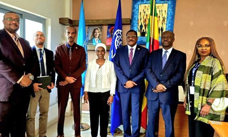 عقد الزين ابراهيم حسين سفير السودان والمندوب الدائم لدي الاتحاد الأفريقي ووفد من السفارة ضم السفير الحافظ عيسي نائب رئيس البعثة والمستشار بالسفارة هيثم الزاكى اجتماعا مع السيدة حبيبتو وانى فال رئيسة بعثة منظمة الهجرة الدولية باثيوبيا يوم 27 يونيو 2025.