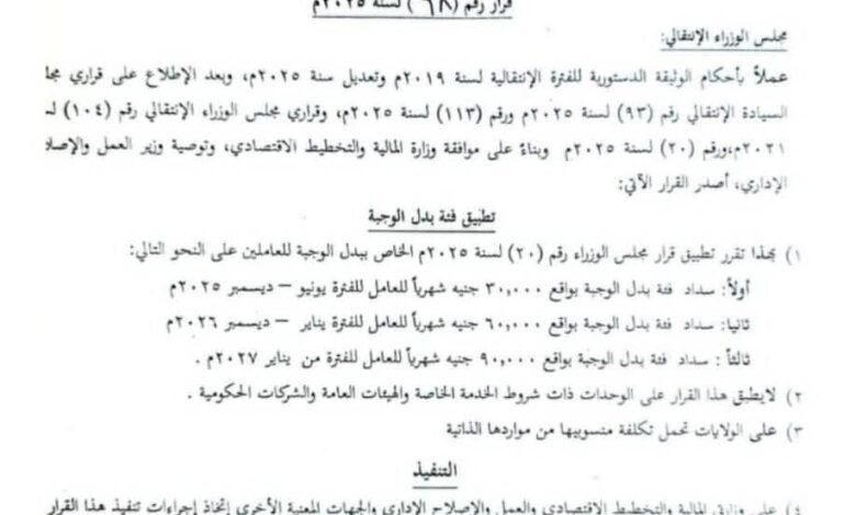 وبحسب القرار الصادر بتاريخ 27 مايو 2025 والممهور بتوقيع رئيس الوزراء المكلف عثمان حسن، فقد تم تخفيض بدل الوجبة من 90 ألف جنيه إلى 30 ألف جنيه شهريًا خلال الفترة من يونيو وحتى ديسمبر 2025.