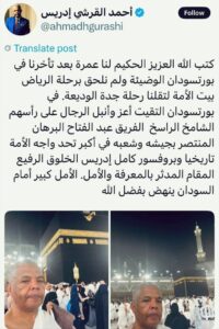 أثار الإعلامي السوداني أحمد القرشي إدريس، المرشح الأبرز لمنصب وزير الإعلام في الحكومة المرتقبة، تفاعلاً واسعاً بعد نشره تدوينة لافتة من داخل الحرم المكي وهو يؤدي مناسك العمرة، عبّر فيها عن دعواته للبرهان والسودان بالنهضة والاستقرار، وسط إشارات رمزية حملت أبعادًا سياسية وروحية عميقة.