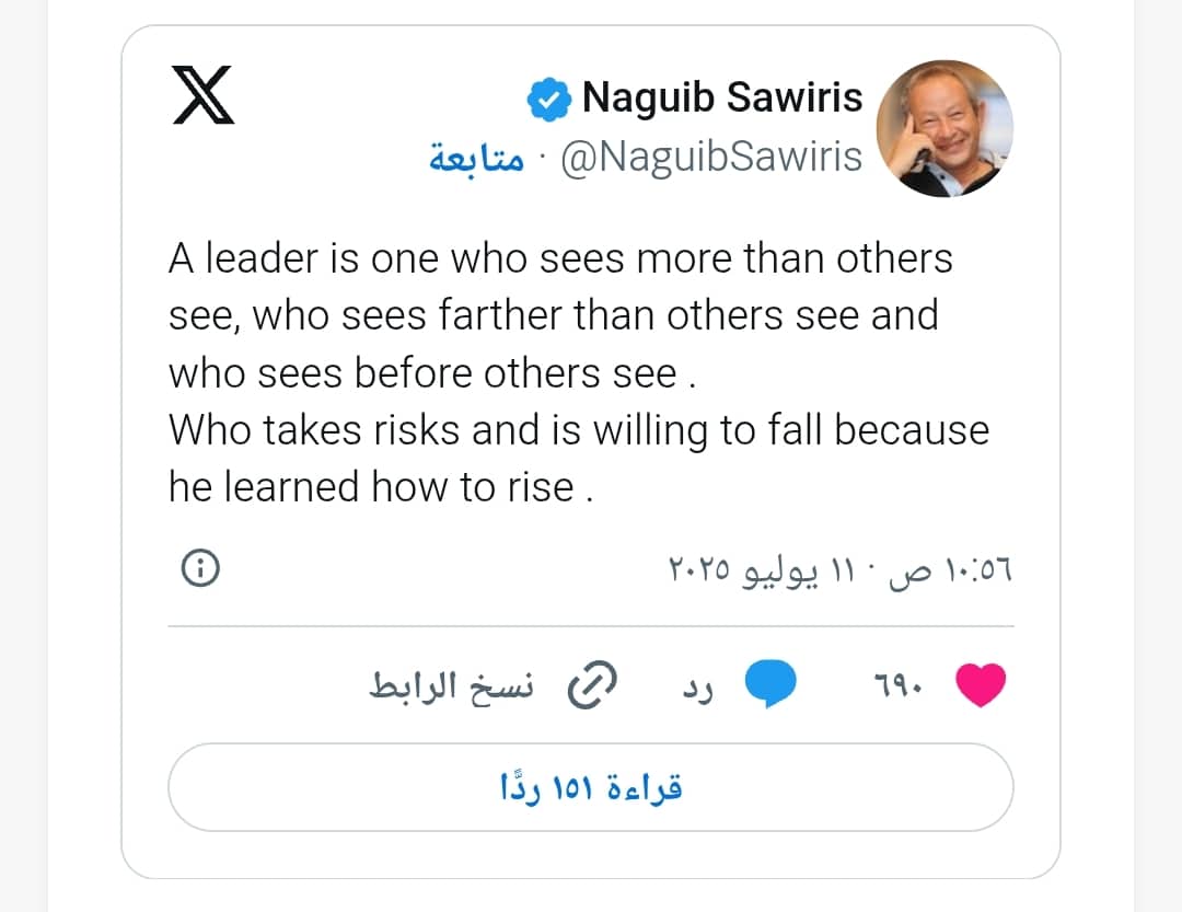 وقال نجيب ساويرس في منشور على حسابه الشخصي عبر منصة “إكس” باللغة الإنجليزية: “القائد هو من يرى أكثر مما يراه الآخرون، ويرى أبعد مما يراه الآخرون، ويرى قبل ما يراه الآخرون”.