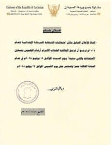دعت السفارة أولياء الأمور إلى متابعة أبنائهم والتواصل مع الإدارة التعليمية بالسفارة للاستفسار عن أي تفاصيل تتعلق بالامتحانات، مؤكدة أن الامتحانات ستحمل الطابع الرسمي الكامل كما هو معمول به في داخل السودان، سواء في المحتوى أو الإجراءات.
