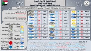 بلغت أعلى درجة حرارة مسجلة بالأمس 45.0°م في مدينة بورتسودان، بينما سجلت كادقلي أدنى درجة حرارة صباح اليوم عند 19.8°م