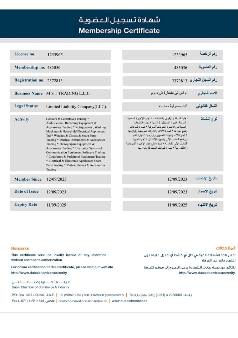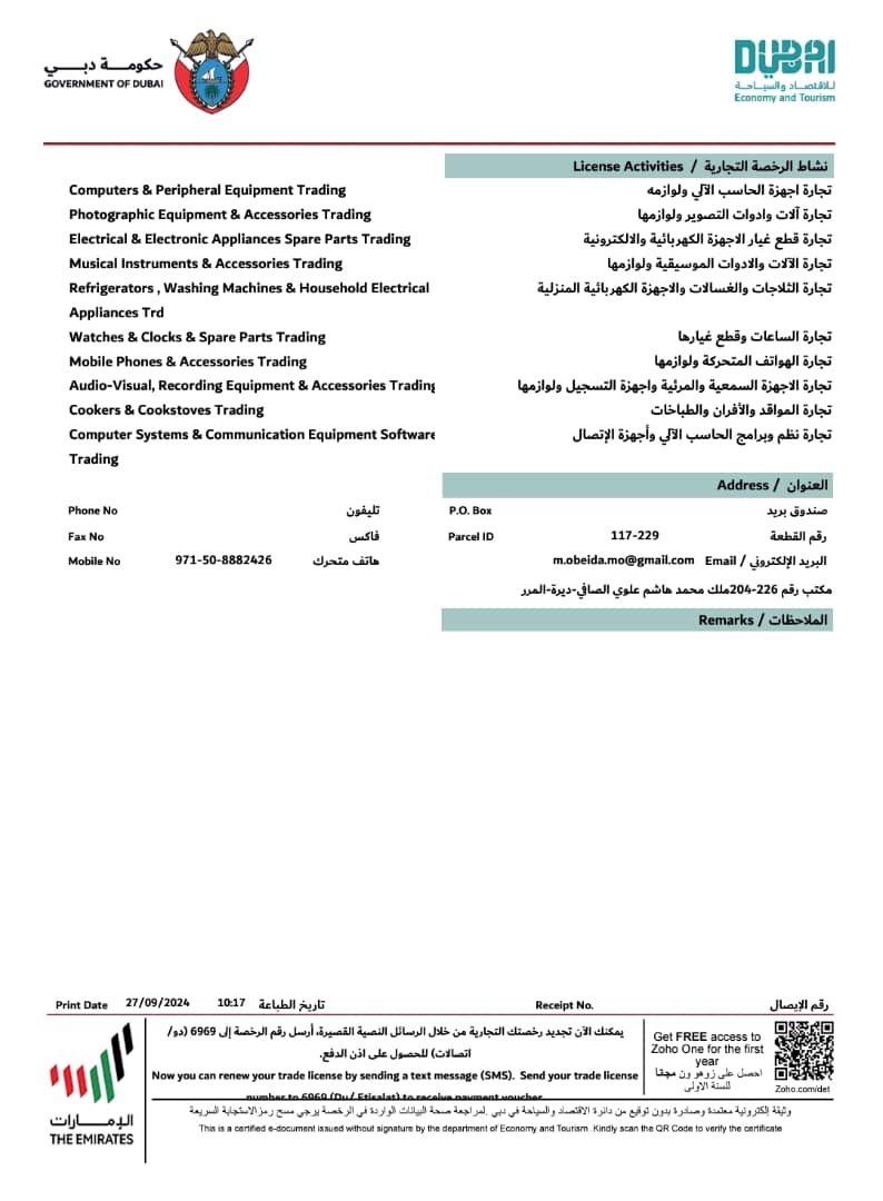 تُظهر وثائق الترخيص أن الشركة متخصصة في تجارة أجهزة الكمبيوتر وملحقاته، الأدوات الموسيقية، الأجهزة الكهربائية والمنزلية مثل الثلاجات والغسالات، الساعات وقطع غيارها، الهواتف المحمولة، أجهزة الصوت والصورة، أجهزة التسجيل، المواقد والأفران، بالإضافة إلى أنظمة الحاسوب وبرامج الاتصال، وكل هذه الأنشطة مُرخّصة رسميًا، وتتم مراقبتها من قبل السلطات الإماراتية المختصة.