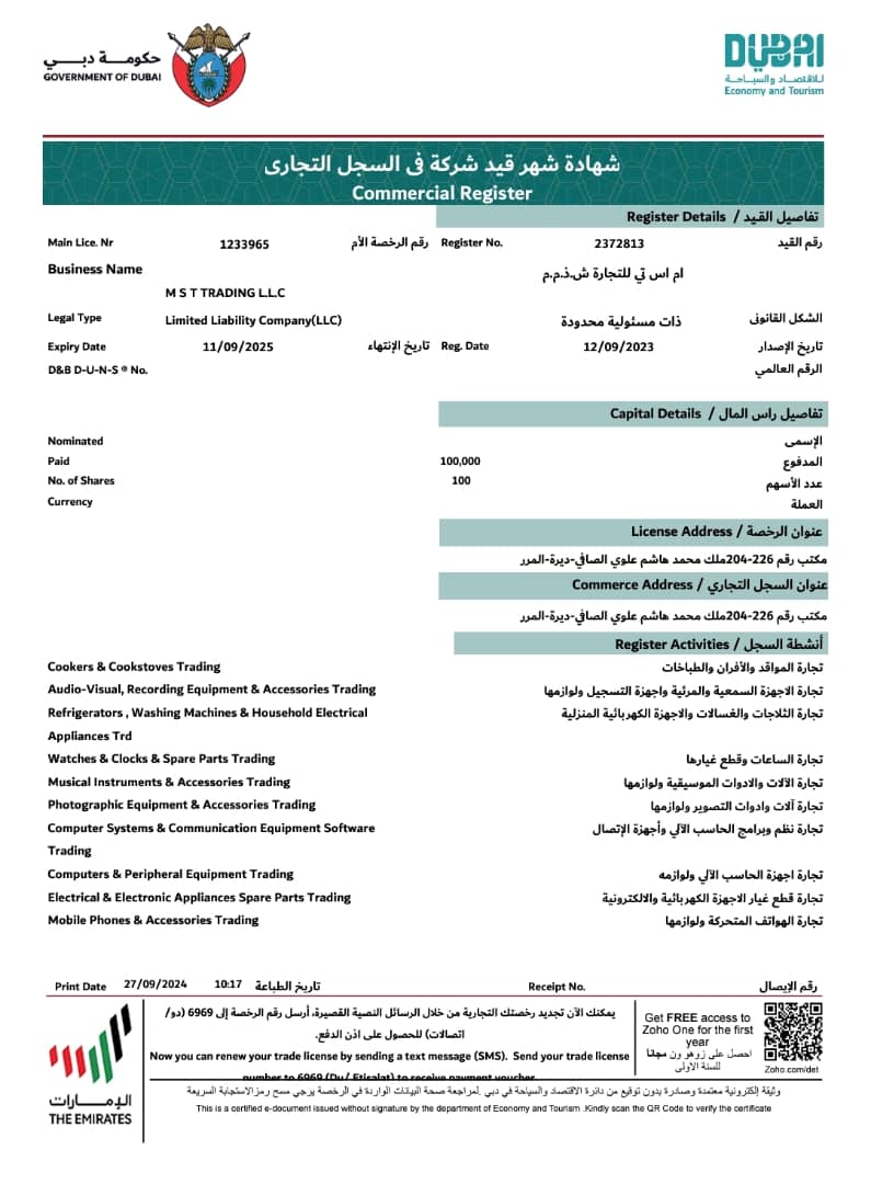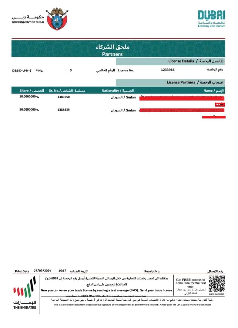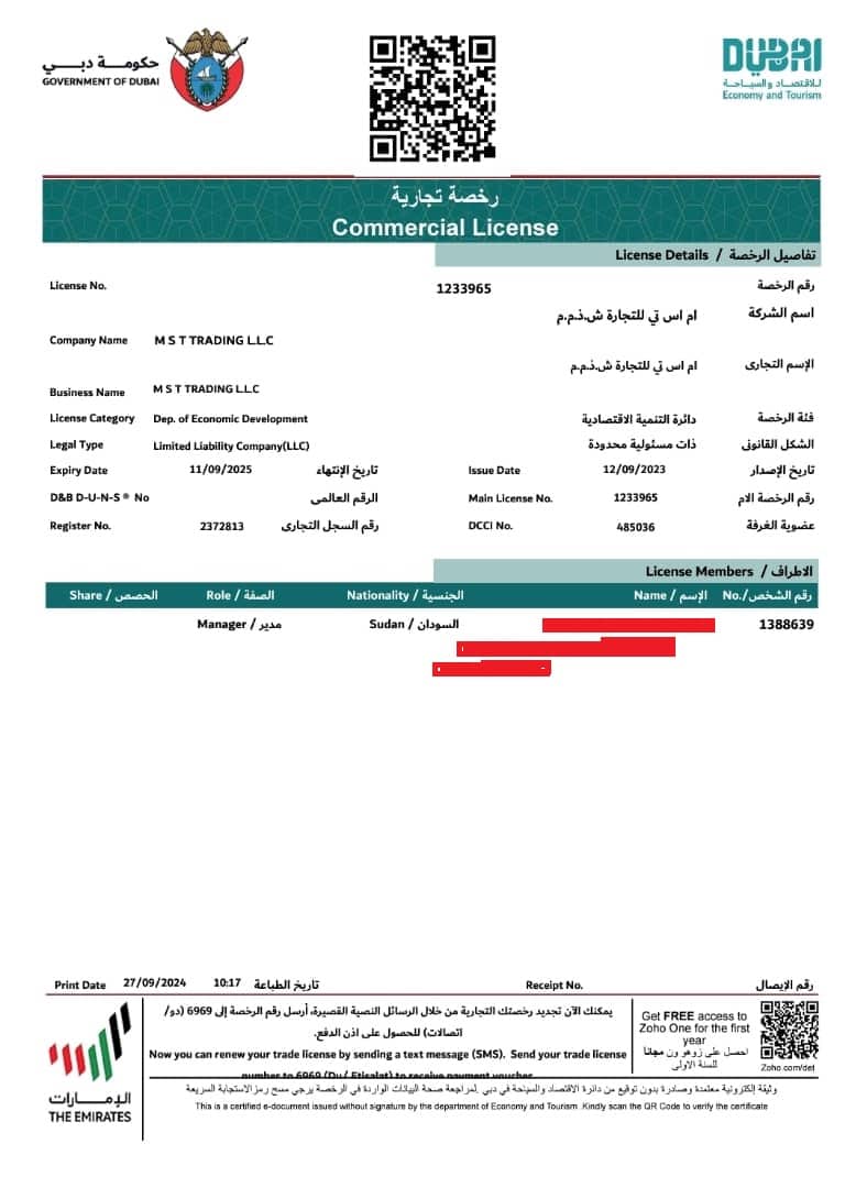 وتظهر وثائق التأسيس الرسمية، أن الشركة ذات المسؤولية المحدودة، تم تسجيلها بتاريخ 12 سبتمبر 2023 تحت رقم الرخصة التجارية 1233965، وتحمل نفس الاسم التجاري الذي تم تسجيله لدى الجهات الإماراتية، وتُعنى بعدة أنشطة تجارية مشروعة.