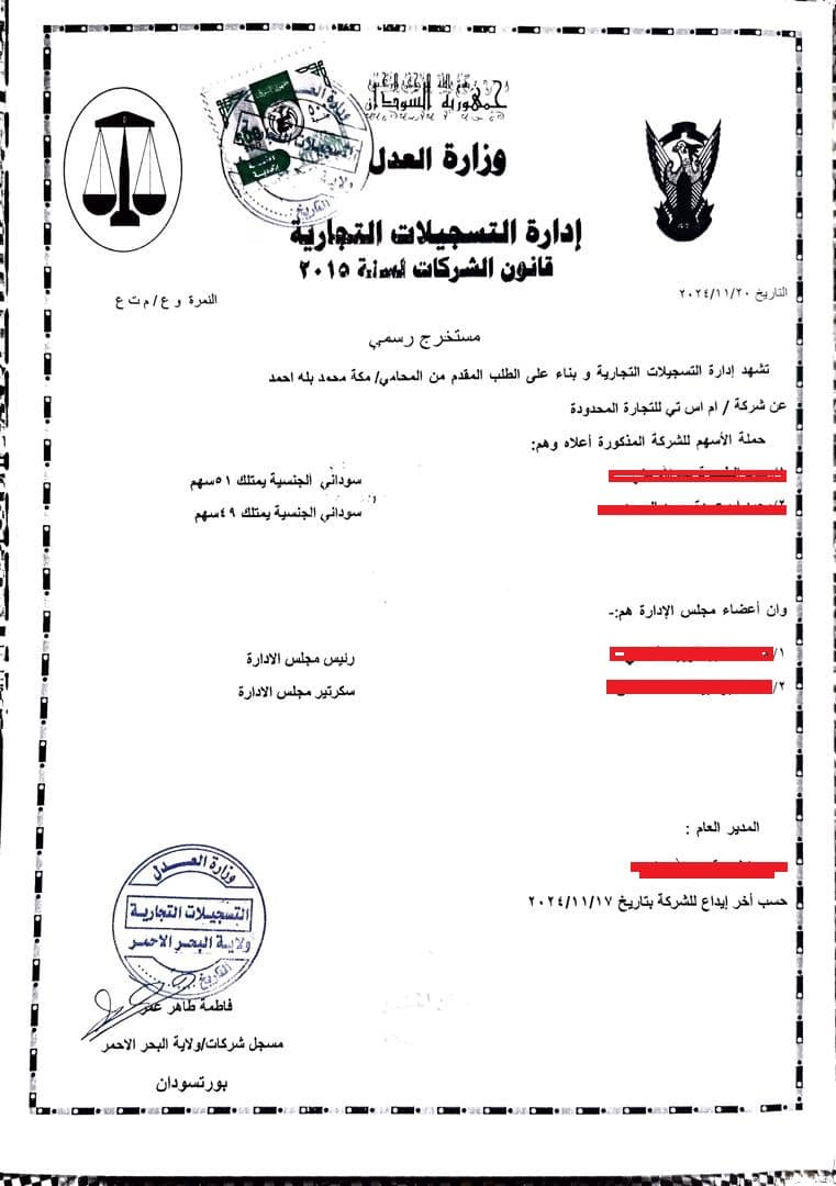 وتوضح الوثائق أن الشركة يمتلكها شخصان سودانيان الجنسية، أحدهما نرمز له بـ م.أ.م.ا، والآخر بـ م.ط.ق.ع، ما يؤكد أن الشركة سودانية بالكامل، وليست مملوكة لأشخاص من جنسيات أخرى كما تم الترويج في بعض المنصات غير الرسمية.