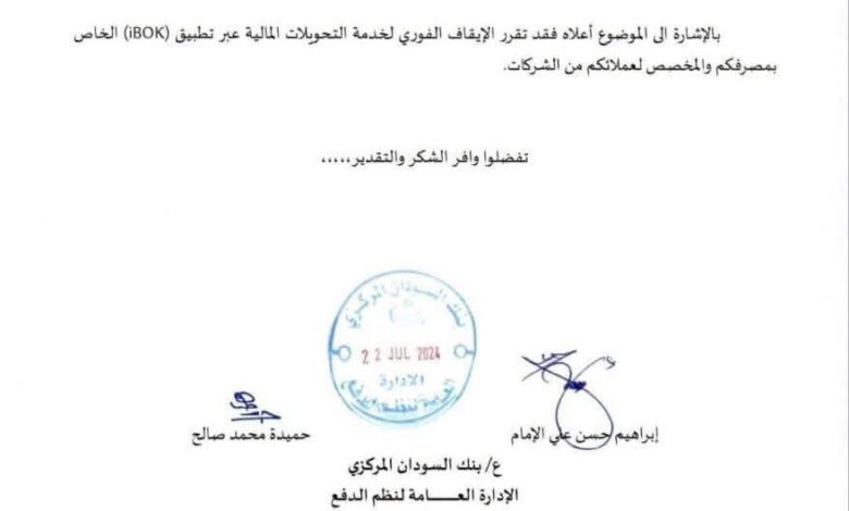 أصدر بنك السودان المركزي قرارًا بإيقاف خدمة التحويلات المالية الفورية عبر تطبيق iBOK الخاص ببنك الخرطوم والمخصص لعملاء الشركات.