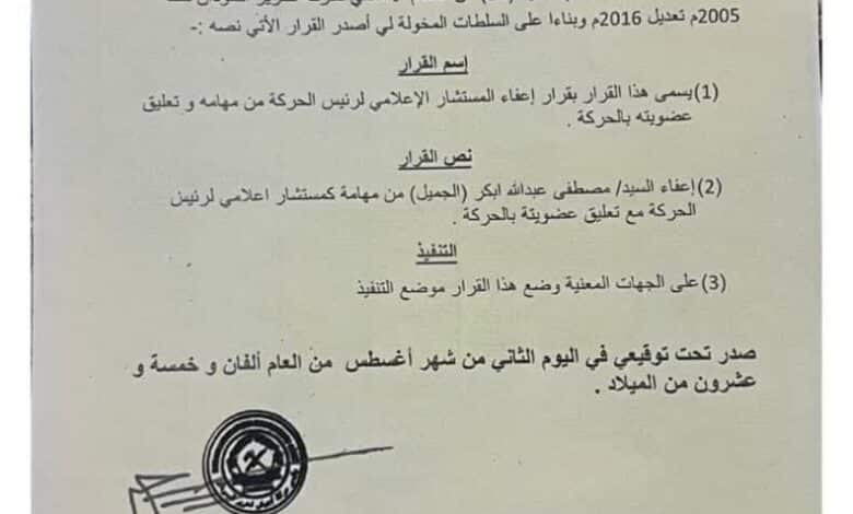 البيان الصادر عن مكتب مناوي اكتفى بالإشارة إلى أن القرار جاء ضمن إجراءات تصحيحية داخلية تستهدف ما وصفه بـ”ضبط الأداء العام داخل المؤسسات القيادية للحركة”، دون الإفصاح عن عدد المستشارين المعفيين أو طبيعة القضايا محل التحقيق.