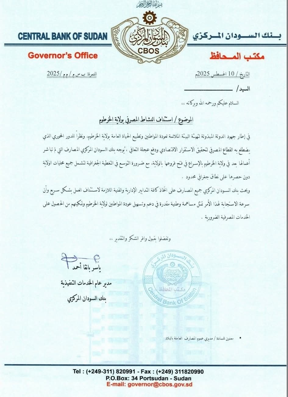 في خطوة تهدف إلى إعادة الحياة الاقتصادية إلى قلب العاصمة، أصدر بنك السودان المركزي توجيهاته العاجلة للمصارف التي لم تستأنف نشاطها بولاية الخرطوم، بضرورة الإسراع في فتح فروعها والتوسع في تغطيتها الجغرافية لتشمل جميع محليات الولاية، وعدم الاكتفاء بنطاقات محدودة.