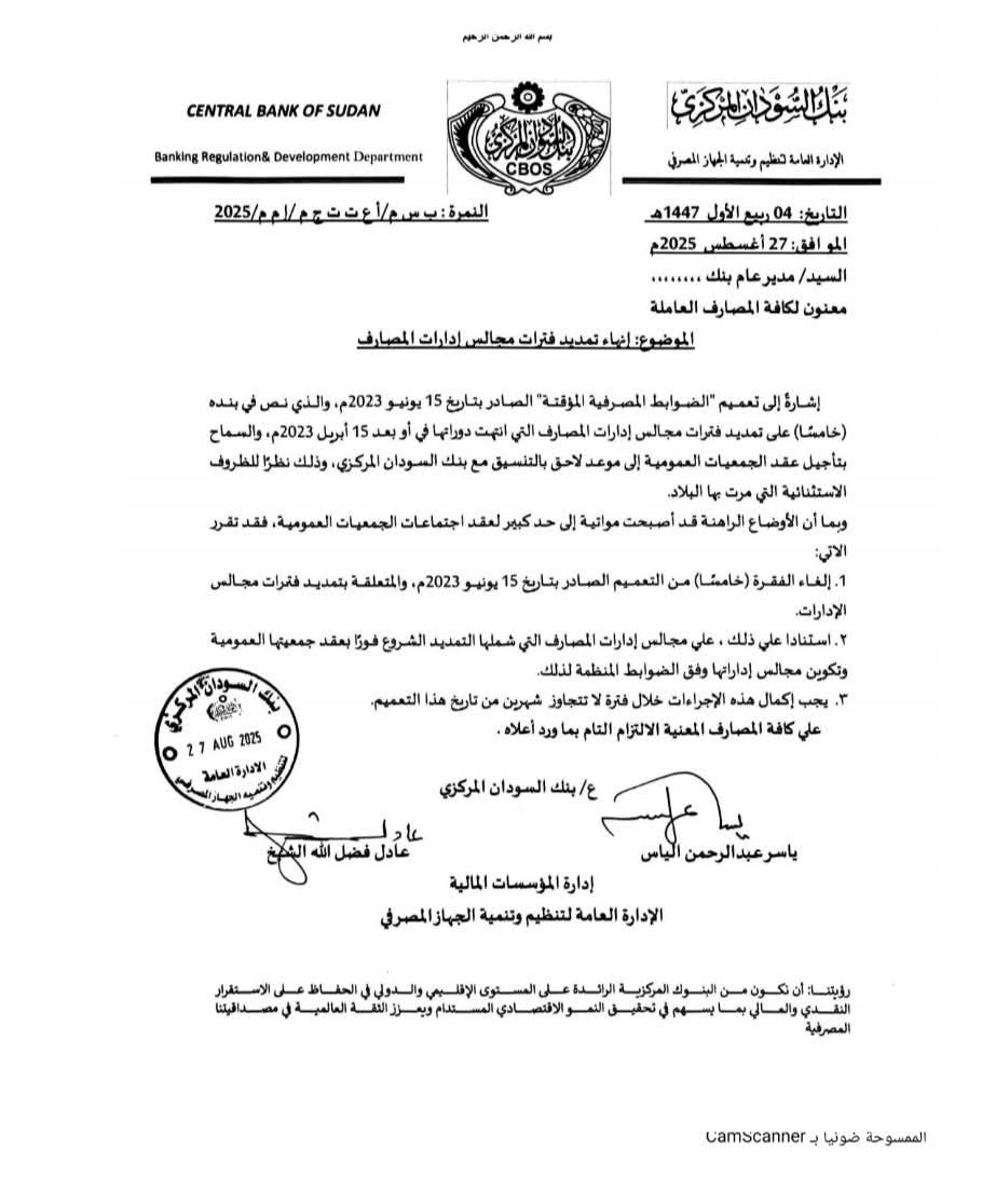 وكان بنك السودان سمح في منشور عممه للمصارف بتاريخ 15 يونيو 2023 بتمديد فترات مجالس إدارات المصارف التي انتهت دورتها في أو بعد 15 أبريل 2023 والسماح بتأجيل عقد جمعياتها العمومية إلى موعد لاحق بالتنسيق مع بنك السودان وذاك نظرا للظروف الاستثنائية التي مرت بها البلاد.