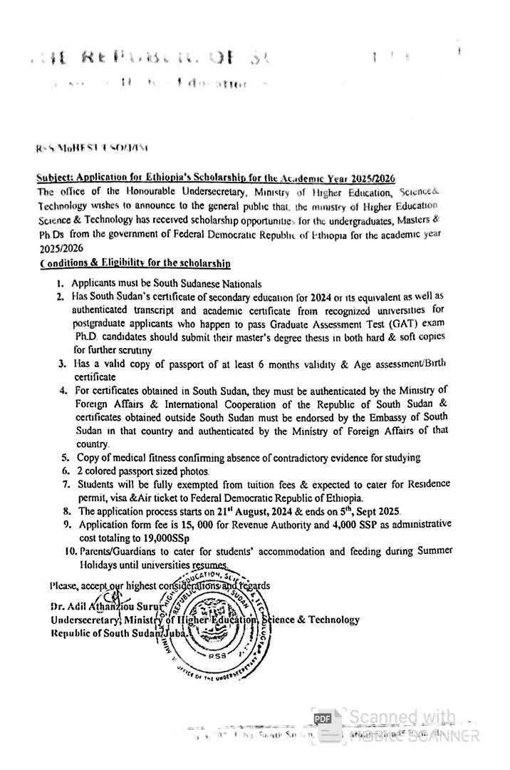 أعلنت وزارة التعليم العام بولاية واراب جنوب السودان عبر مكتبها التنسيقي في جوبا عن فتح باب التقديم لـ15 منحة دراسية مقدمة من الحكومة الفيدرالية الإثيوبية لصالح طلاب جنوب السودان للعام الأكاديمي 2025/2026.