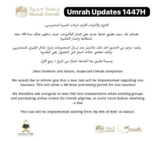 وبحسب التعميم الموجه إلى شركات العمرة، سيتم تطبيق شرط يقضي بتخصيص مدة زمنية لا تقل عن 48 ساعة لمعالجة وإصدار التأشيرة من تاريخ التقديم، ما يستدعي ترتيب البرامج الزمنية للمجموعات بعناية قبل الشروع في حجز تذاكر السفر.