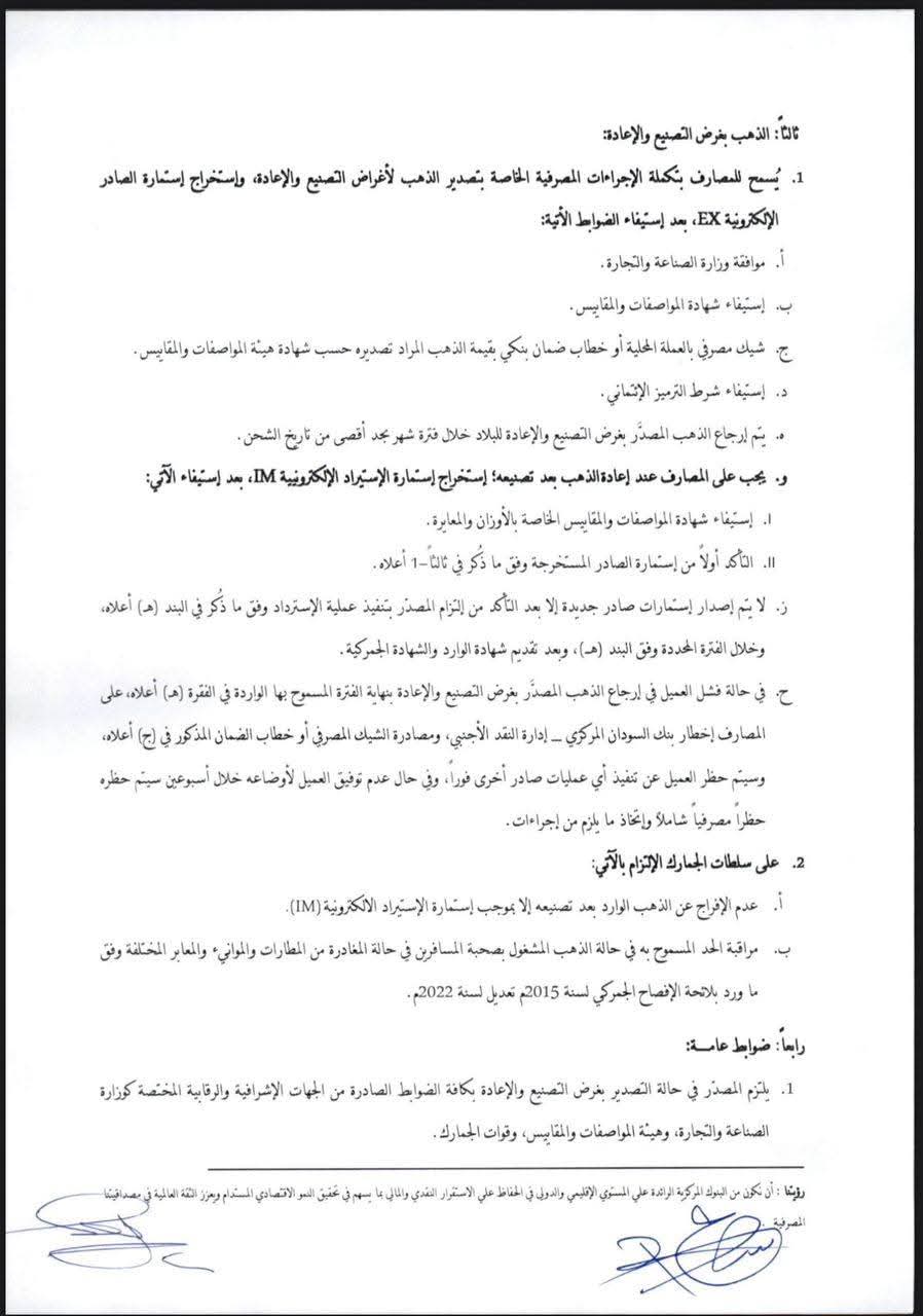 المنشور استثنى فقط عمليات صادر الذهب الحر وذهب شركات مخلفات التعدين المنفذة عبر الدفع المقدم، في إشارة إلى استمرار بعض النوافذ المحدودة للتصدير ضمن الضوابط الجديدة.