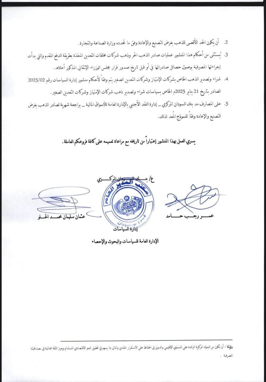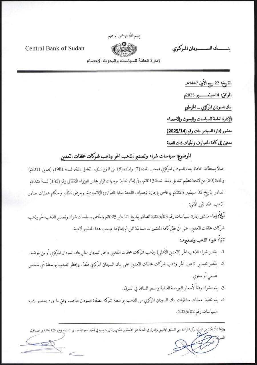 أصدر بنك السودان المركزي منشوراً جديداً يقضي بحظر شراء وتصدير الذهب من قبل الشركات والأفراد، بما في ذلك إنتاج التعدين الأهلي ومخلفات التعدين، واقتصار هذه العمليات على البنك المركزي أو من يفوضه رسمياً، في خطوة تهدف إلى إحكام الرقابة على قطاع الذهب والحد من التهريب.