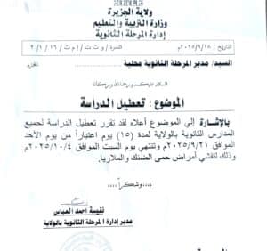 في خطوة عاجلة ومفاجئة، أعلنت وزارة التربية والتعليم بولاية الجزيرة عن قرار يقضي بتعطيل الدراسة في جميع المدارس الثانوية لمدة خمسة عشر يومًا، وذلك اعتبارًا من يوم الأحد 21 سبتمبر 2025 وحتى يوم السبت 4 أكتوبر 2025.
