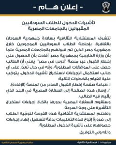 يأتي هذا الإعلان ضمن جهود المستشارية الثقافية بسفارة السودان في القاهرة لتسهيل شؤون الطلاب السودانيين في مصر، خاصة مع الإقبال المتزايد على الجامعات المصرية، والتي باتت وجهة رئيسية للطلاب السودانيين خلال الأعوام الأخيرة. وأكدت الملحقية الثقافية أنها تضع مصلحة الطلاب في مقدمة أولوياتها، وتعمل باستمرار على التنسيق مع الجهات المصرية المختصة لتذليل أي عقبات تواجههم.