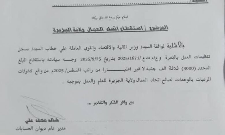 أصدرت حكومة ولاية الجزيرة قرارًا مثيرًا للجدل يقضي بتنفيذ استقطاع شهري من رواتب العاملين بالولاية، بواقع 3000 جنيه لصالح اتحاد نقابات عمال الولاية، و800 جنيه للصندوق القومي لرعاية الطلاب، ليصل إجمالي المبلغ المستقطع شهريًا إلى أكثر من 120 مليار جنيه سوداني، من أجور ما يزيد عن 55 ألف عامل.