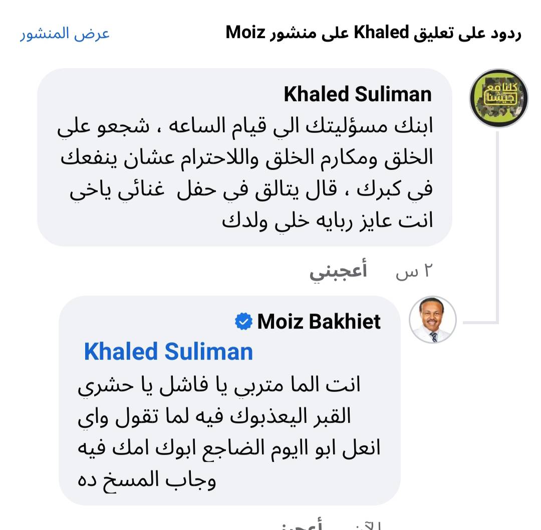 فجاء ردّ المعز بخيت صادمًا، إذ كتب: “إنت الما متربي يا فاشل يا حشري، القبر يعذبك فيه لما تقول واي، أنعل أبو اليوم الضاجع أبوك أمك فيه وجاب المسخ ده”.