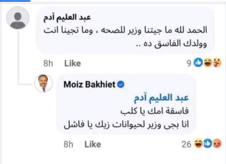 ولم يتوقف الوزير المقال عند هذا الحد، إذ ردّ على متابع آخر يُدعى عبد العليم آدم كتب له: “الحمد لله ما جيتنا وزير للصحة، وما تجينا إنت وولدك الفاسق ده”.