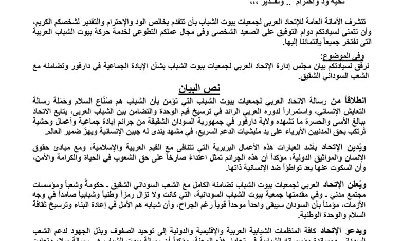 كما عبّر الاتحاد عن أمله في أن يعمّ السلام ربوع السودان، وأن تتوقف دوامة العنف، مؤكدًا أن صوت الشباب العربي سيظل مناصرًا للعدالة والكرامة الإنسانية.