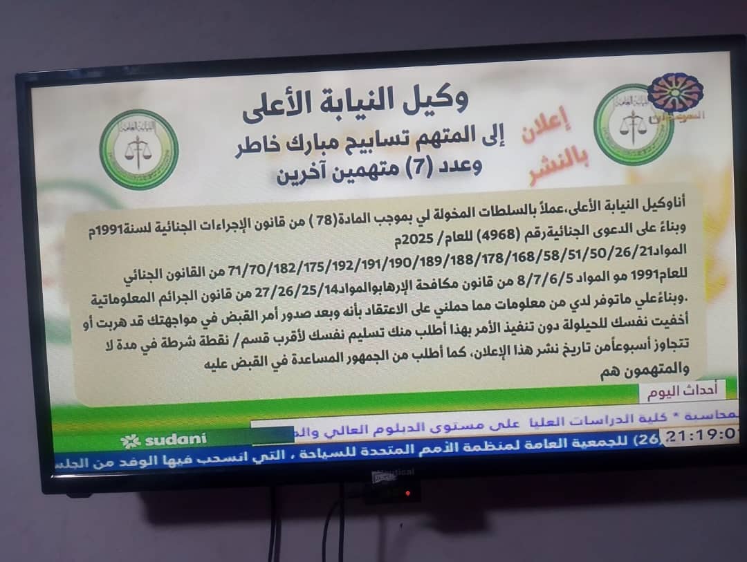 أصدرت النيابة العامة في السودان أوامر قبض بحق عدد من الشخصيات الإعلامية والسياسية، من بينهم تسابيح مبارك خاطر، رشا عوض، عبد المنعم الربيع، خادم الله خشمين (المعروف بـ”شيراز”)، أحمد الضي، صباح محمد الحسن، سارة صابون (سارة طه)، وفاطمة عبد الله، إلى جانب آخرين.