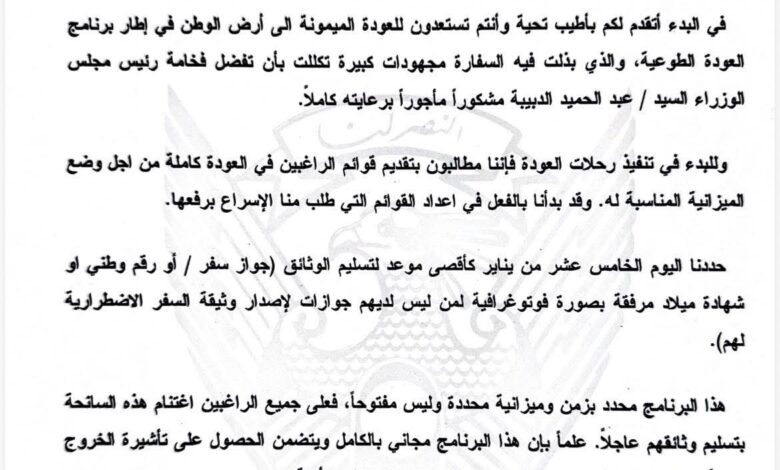 ودعت السفارة المواطنين الراغبين في الاستفادة من البرنامج إلى الإسراع بتسليم وثائقهم قبل الخامس عشر من يناير، وهو الموعد النهائي المحدد لتقديم الجوازات أو الوثائق البديلة مثل الرقم الوطني أو شهادة الميلاد مرفقة بصورة فوتوغرافية، لمن لا يملكون جوازات سفر، تمهيداً لإصدار وثائق سفر اضطرارية لهم.