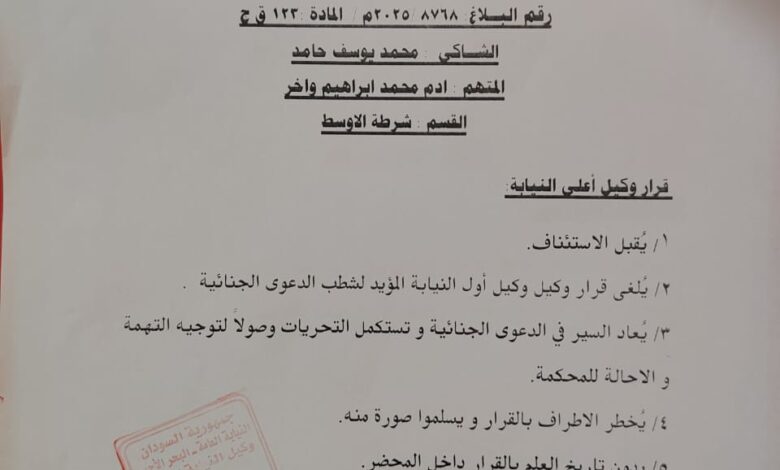 أعادت النيابة العامة العليا في السودان فتح ملف بلاغ التزوير المتعلق بقيادات هيئة علماء السودان، بعد أن ألغت القرار السابق الصادر عن وكيل ثاني النيابة حمد النيل والقاضي بشطب الدعوى.