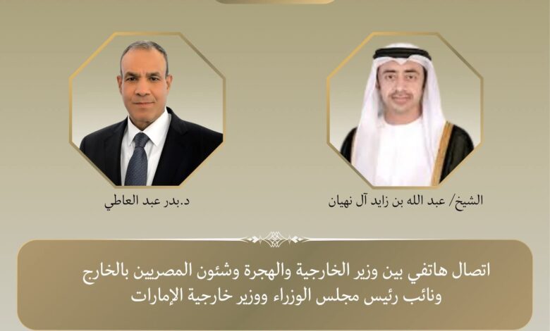 أجرى د. بدر عبد العاطي، وزير الخارجية والهجرة وشؤون المصريين بالخارج، اتصالاً هاتفياً مع سمو الشيخ عبد الله بن زايد آل نهيان، نائب رئيس مجلس الوزراء ووزير الخارجية بدولة الإمارات العربية المتحدة، يوم الخميس 22 يناير، في إطار التنسيق المتواصل بين البلدين الشقيقين حول سبل دعم العلاقات الثنائية وبحث القضايا الإقليمية ذات الاهتمام المشترك.