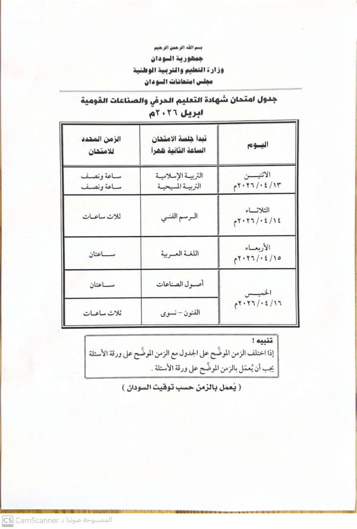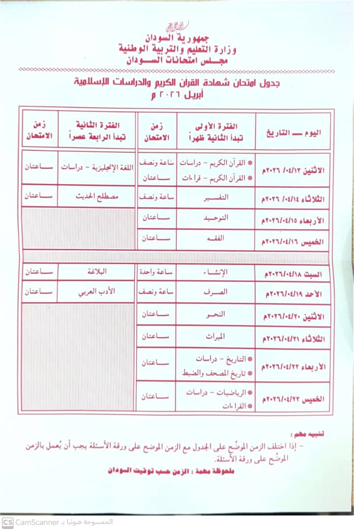 وأوضح مدير الإدارة العامة لامتحانات السودان، خالد علي عثمان، أن الجداول شملت مختلف المسارات التعليمية، بما في ذلك الشهادة الأكاديمية والفنية، وشهادة القرآن الكريم والدراسات الإسلامية، إضافة إلى شهادة التعليم الحرفي. وأشار إلى أن الامتحانات ستبدأ يوم الاثنين 13 أبريل 2026 بمادتي التربية الإسلامية والتربية المسيحية، على أن تختتم يوم الخميس 23 أبريل بمادة اللغة الإنجليزية، مؤكداً أن الجلسات ستنطلق في تمام الساعة الثانية بعد الظهر بتوقيت السودان في جميع المراكز دون استثناء.