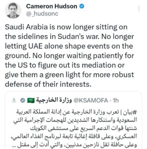 كشف المحلل الاستراتيجي والمسؤول السابق بالخارجية الأمريكية، كاميرون هيدسون، عن تحول جذري وجوهري في التعاطي السعودي مع ملف الحرب في السودان، مؤكداً أن المملكة العربية السعودية لم تعد تقف مكتوفة الأيدي تجاه الأحداث الجارية.