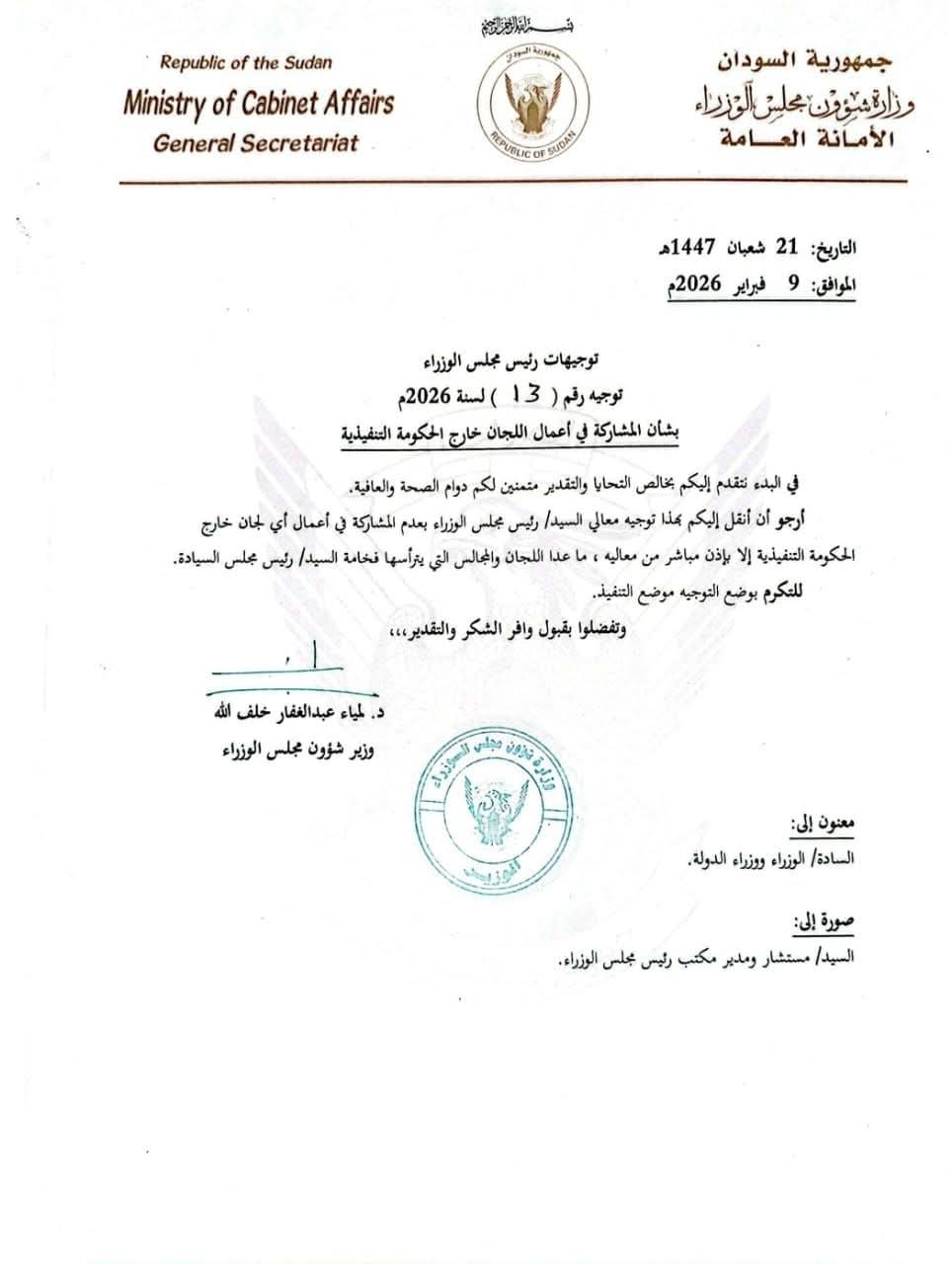 أصدر رئيس الوزراء السوداني كامل إدريس قراراً يقضي بمنع وزرائه من المشاركة في أعمال أي لجان خارج نطاق الحكومة التنفيذية إلا بإذن مباشر منه، مع استثناء اللجان والمجالس التي يرأسها رئيس مجلس السيادة.