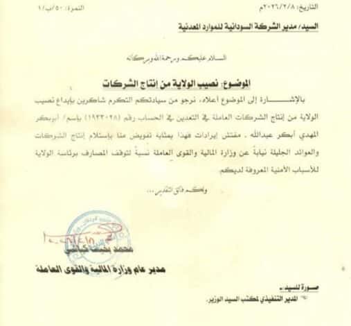 ووجهت الوزارة، عبر مكتب المدير العام، خطاباً بتاريخ 8 فبراير 2026 إلى مدير الشركة السودانية للموارد المعدنية، تطلب فيه إيداع نصيب الولاية من إنتاج شركات التعدين في حساب يتبع لموظف يدعى (أبوبكر المهدي أبكر عبدالله).