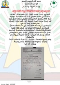 أعلنت وزارة التربية والتعليم بالولاية الشمالية عن تعديل مواعيد العمل الرسمية بكافة مرافقها ووحداتها الحكومية، وذلك تماشياً مع حلول شهر رمضان المعظم لعام 1447هـ. ويأتي هذا القرار استناداً إلى لائحة الخدمة المدنية بالولاية التي تتيح تخفيض ساعات العمل خلال الشهر الفضيل تيسيراً على العاملين.