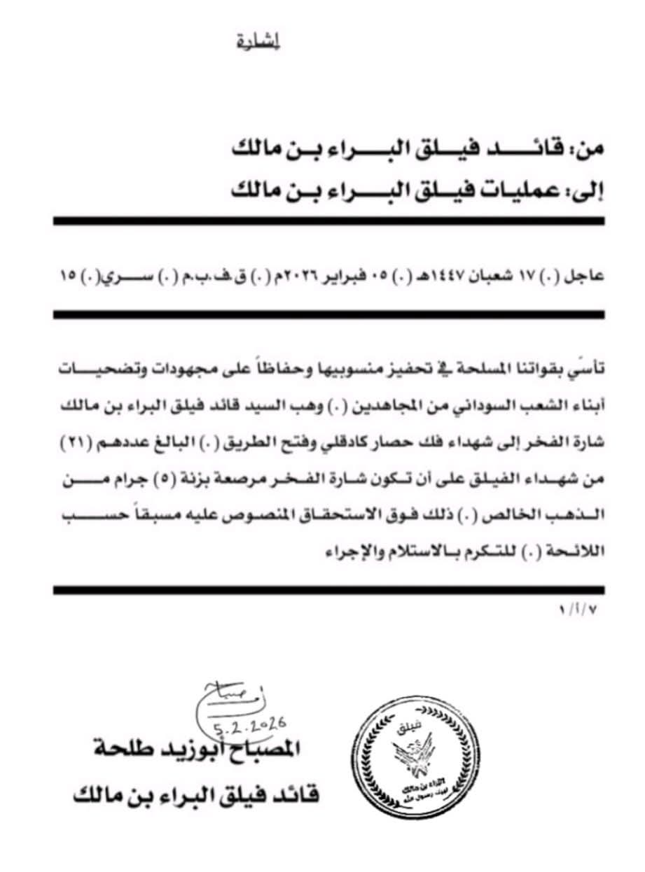 في خطوة رمزية لتمجيد تضحيات المقاتلين، منح قائد فيلق البراء بن مالك، المعروف بلقب المصباح طلحة، شهداء معارك فك حصار كادوقلي وفتح الطريق “شارة الفخر” المرصعة بالذهب الخالص.