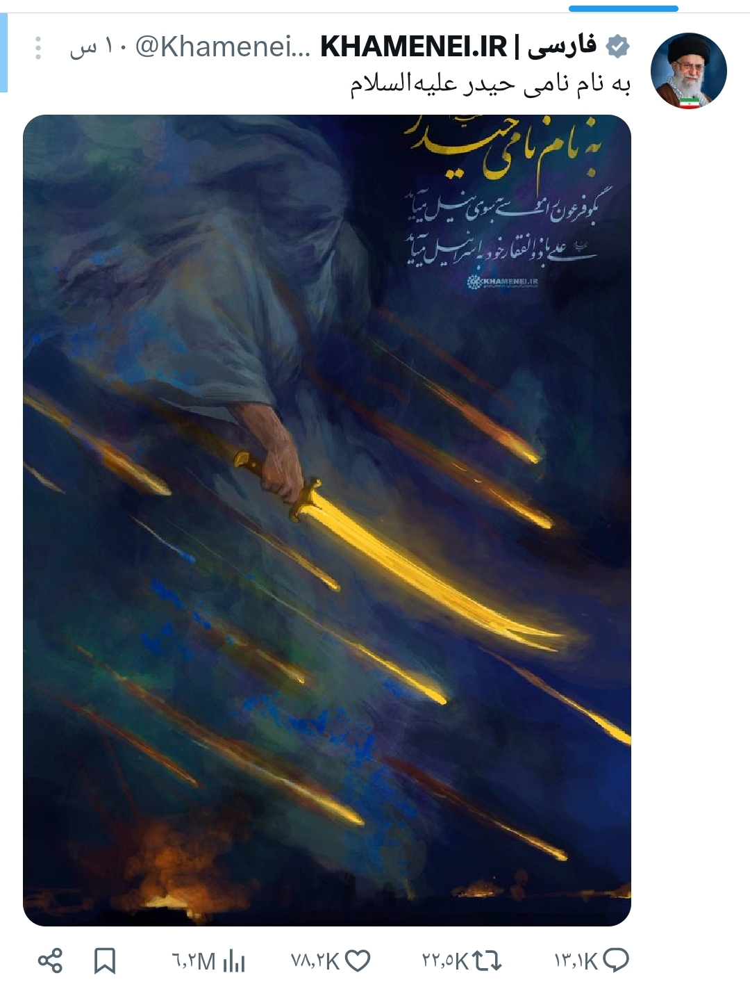 في خطوة أثارت جدلاً واسعاً، نشر الحساب الرسمي للمرشد الأعلى الإيراني علي خامنئي على منصة “إكس” عبارة مقتضبة جاء فيها: “باسم حيدر عليه السلام”. هذا التطور جاء مباشرة بعد إعلان الرئيس الأمريكي أن المرشد الإيراني قُتل في الضربات المشتركة الأمريكية – الإسرائيلية التي استهدفت مواقع في إيران.